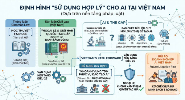 Trên cơ sở đó, Việt Nam không cần du nhập khái niệm Fair Use, mà cần vận dụng ngay nền tảng tại Điều 25. Theo đó, cần bổ sung quy định: Khoanh vùng hành vi khai thác dữ liệu (TDM) phục vụ đào tạo thuật toán AI (giới hạn cho mục đích phi thương mại hoặc nghiên cứu cơ bản) thuộc trường hợp ngoại lệ không xâm phạm quyền tác giả. Nếu không có cơ sở pháp lý này, các doanh nghiệp AI Việt Nam có thể sẽ phải đối mặt với rủi ro kiện tụng trong tương lai vì cơ chế chưa đủ minh bạch và rõ ràng.