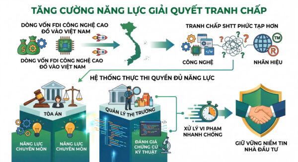 Khi dòng vốn FDI trong lĩnh vực công nghệ cao đổ vào Việt Nam, các tranh chấp về quyền SHTT, đặc biệt là tranh chấp liên quan đến công nghệ và nhãn hiệu, sẽ phức tạp hơn. Việc đảm bảo một hệ thống thực thi quyền (Tòa án, Quản lý thị trường) có đủ năng lực chuyên môn để đánh giá chứng cứ kỹ thuật và xử lý vi phạm nhanh chóng là yếu tố then chốt để giữ vững niềm tin của nhà đầu tư.