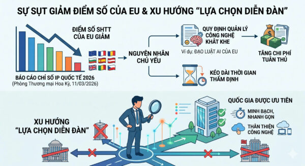 Theo Báo cáo “Chỉ số IP Quốc tế 2026” do Phòng Thương mại Hoa Kỳ công bố ngày 11/03/2026, điểm số bảo hộ SHTT của 8 quốc gia thuộc Liên minh Châu Âu (EU) có dấu hiệu sụt giảm [4].