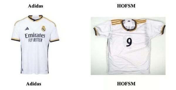 Adidas đã kiện Hall of Fame Sports Memorabilia về dòng áo bóng đá của họ (bên phải), cho rằng dòng sản phẩm này vi phạm nhãn hiệu ba sọc của Adidas. (Hồ sơ tòa án USDC Oregon)