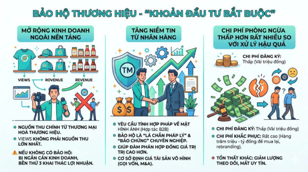 Ngược lại, việc sở hữu văn bằng bảo hộ nhãn hiệu không chỉ là “lá chắn pháp lý” mà còn là “bảo chứng” cho sự chuyên nghiệp, giúp nhà sáng tạo nội dung dễ dàng đàm phán hợp đồng với giá trị cao hơn.