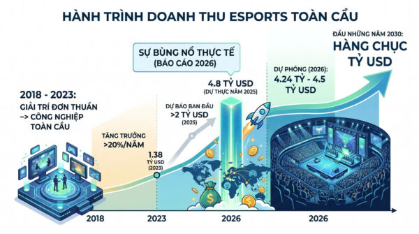 Tuy nhiên, sự bùng nổ thực tế đã vượt xa con số đó. Theo các báo cáo phân tích thị trường năm 2026, quy mô doanh thu toàn cầu của ngành Esports đã đạt ước tính lên đến 4,8 tỷ USD trong năm 2025 [2] và dự phóng tiếp tục bứt phá mạnh mẽ, có thể đạt quy mô từ 4,24 tỷ USD đến 4,5 tỷ USD trong năm 2026, với đà tăng trưởng tiến tới hàng chục tỷ USD vào đầu những năm 2030 [3].