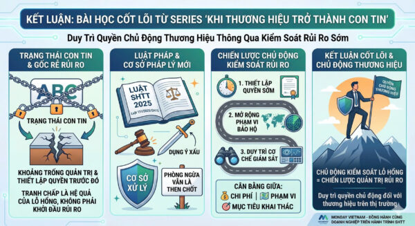 Kết thúc series “Khi Thương Hiệu Trở Thành Con Tin”, có thể thấy rằng tranh chấp không phải là điểm khởi đầu của rủi ro, mà thường là hệ quả của những khoảng trống trong việc thiết lập và quản trị quyền từ trước đó. Việc chủ động kiểm soát các khoảng trống này chính là yếu tố quyết định để doanh nghiệp duy trì quyền chủ động đối với thương hiệu của mình trên thị trường.